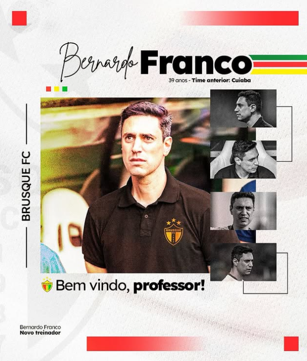 O Brusque anunciou, no começo da tarde desta quinta-feira, o técnico Bernardo Franco como novo treinador do time para a continuidade da Série C do Campeonato Brasileiro. O anúncio vem um dia depois da saída de Filipe Gouveia, que estava à frente do time até então.